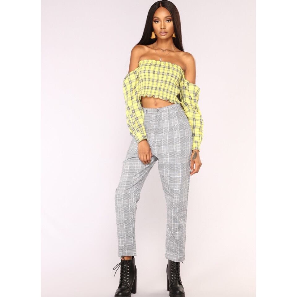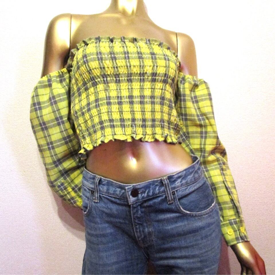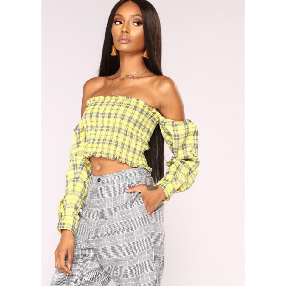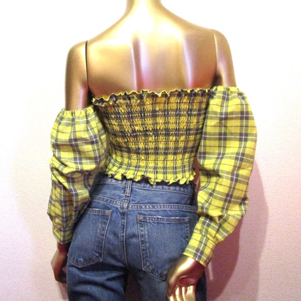 アメリカの大手有名オンラインセレクトショップ “FASHION NOVA” より、今年流行のイエローチェックオフショルダートップスです。