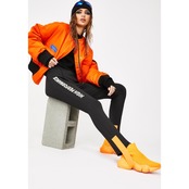 このレギンスはユニークな形をしていて、靴にゴムの部分をひっかけて履いたり、足に直接ひっかけてその上からスニーカーなどを履いたりできる商品です。